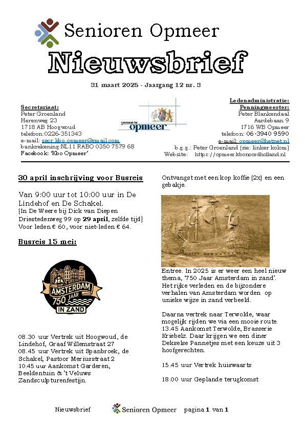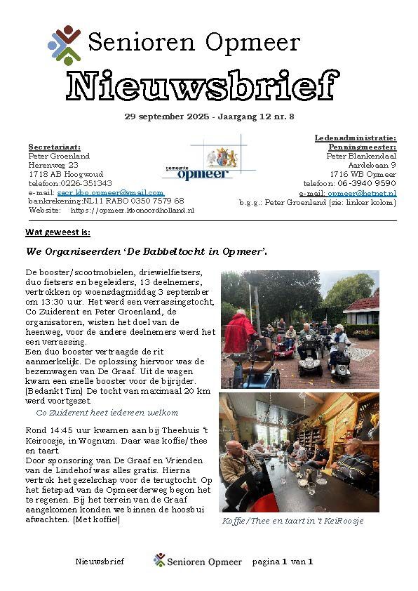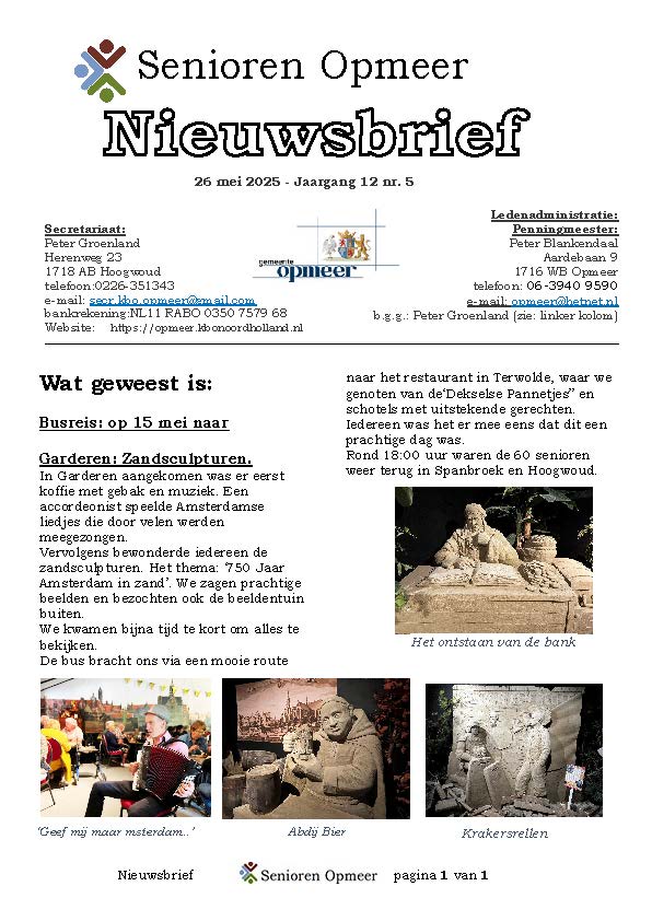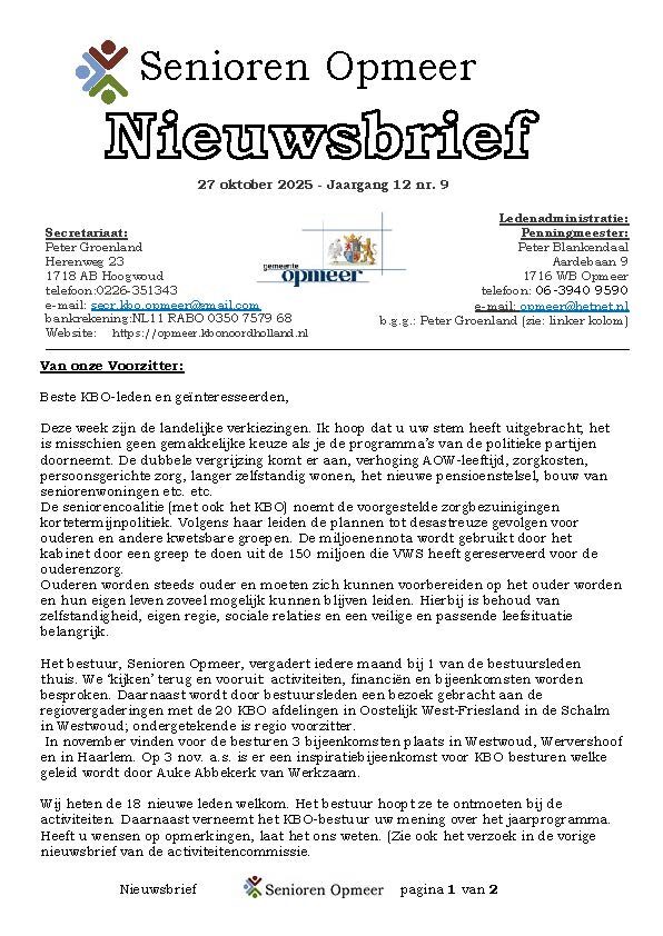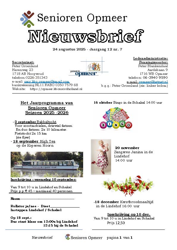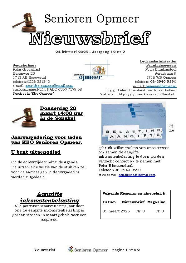 U bevindt zich op de Nieuwsbriefpagina van KBO Senioren Opmeer. Hier kunt u een Nieuwsbrief openen door op een afbeelding van een Nieuwsbrief te klikken. Dan leest u de Nieuwsbrief on-line. Een praktisch voordeel hiervan is dat verwijzigingen (linken) naar pagina’s op onze website maar ook verwijzigingen naar andere websites en/of e-mail adressen actief zijn. Door op zo’n verwijzing te klikken gaat u automatisch naar een andere pagina, website of start uw e-mail programma om een e-mail te versturen.