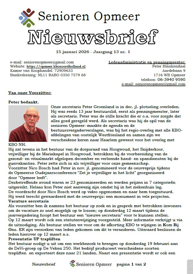 U bevindt zich op de Nieuwsbriefpagina van KBO Senioren Opmeer. Hier kunt u een Nieuwsbrief openen door op een afbeelding van een Nieuwsbrief te klikken. Dan leest u de Nieuwsbrief on-line. Een praktisch voordeel hiervan is dat verwijzigingen (linken) naar pagina’s op onze website maar ook verwijzigingen naar andere websites en/of e-mail adressen actief zijn. Door op zo’n verwijzing te klikken gaat u automatisch naar een andere pagina, website of start uw e-mail programma om een e-mail te versturen.